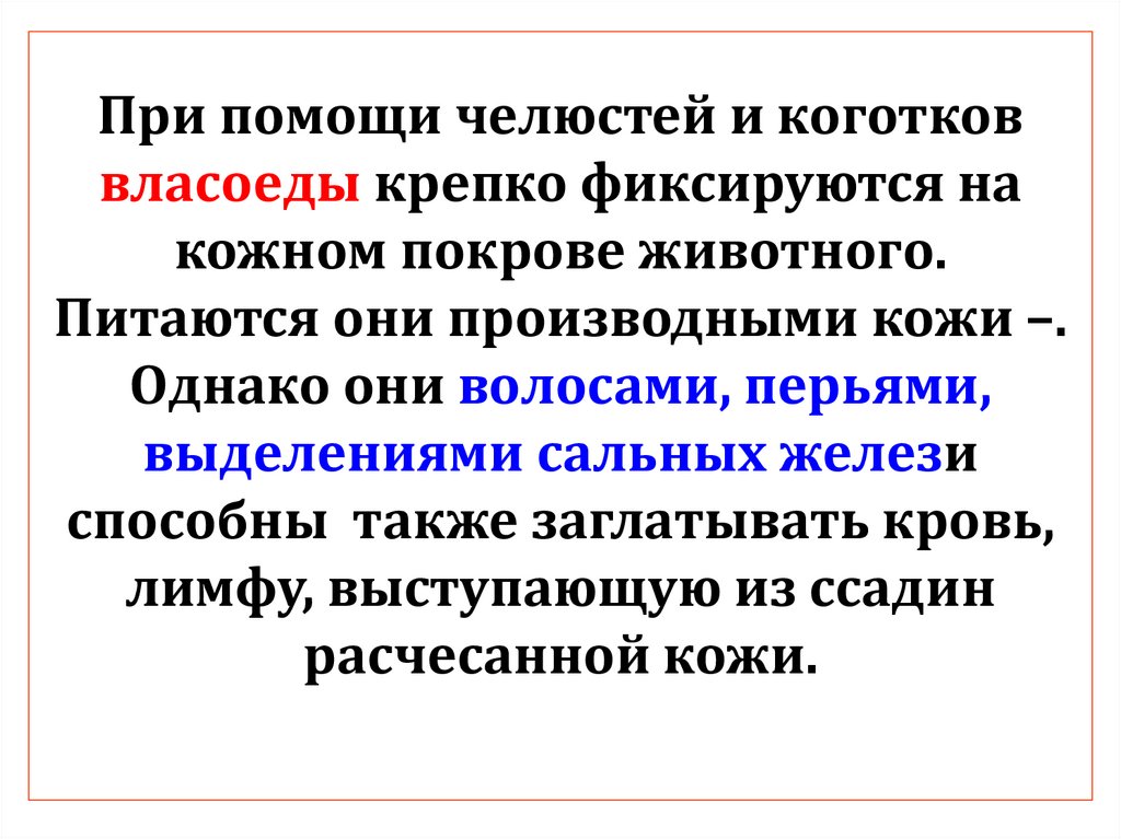 8. При помощи челюстей и коготков власоеды крепко фиксируются на кожном покрове животного. Питаются они производными кожи –.