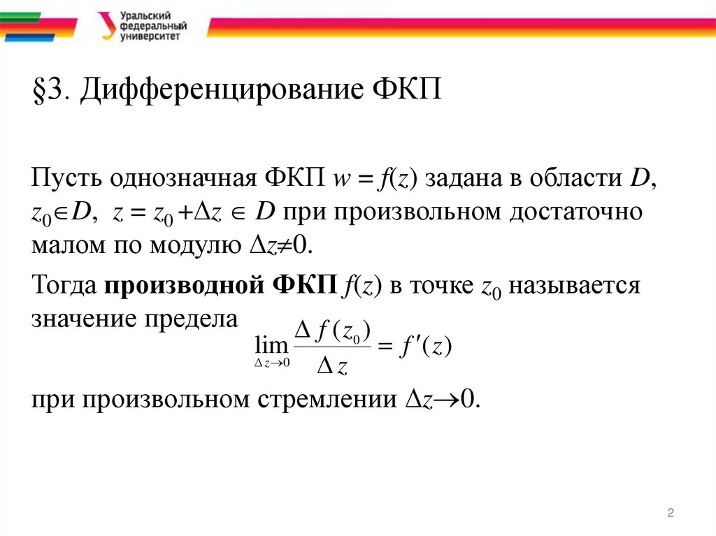 §3. Дифференцирование ФКППусть однозначная ФКП w = f(z) задана в области D,