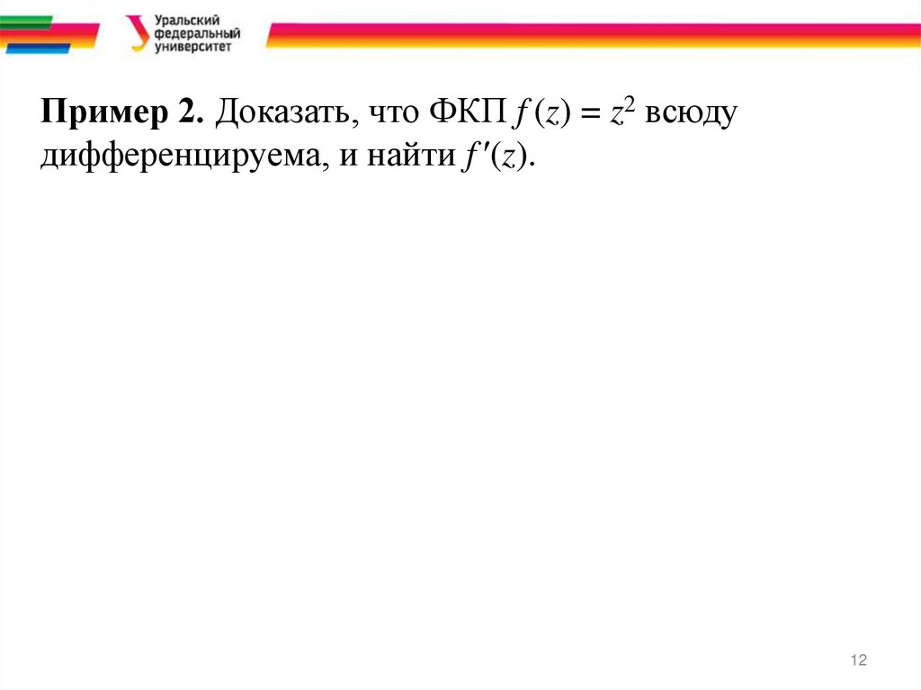 Пример 2. Доказать, что ФКП f (z) = z2 всюдудифференцируема, и найти f (z).