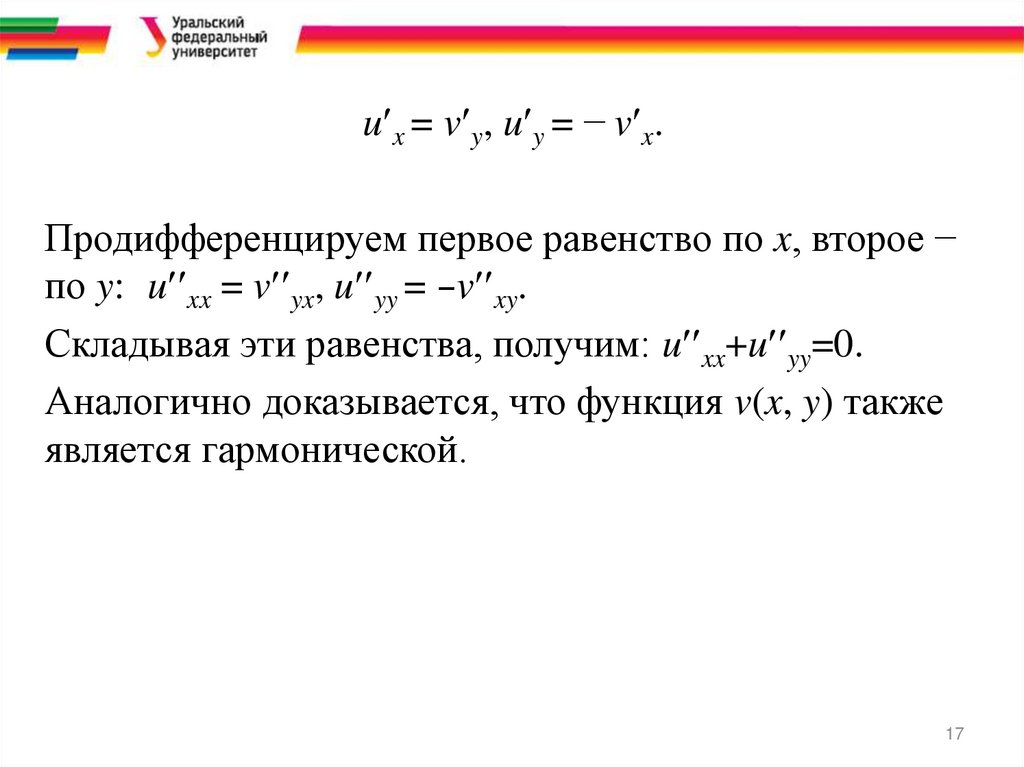 Сравнивая эти равенства, получим u x = v y, u y = − v x.