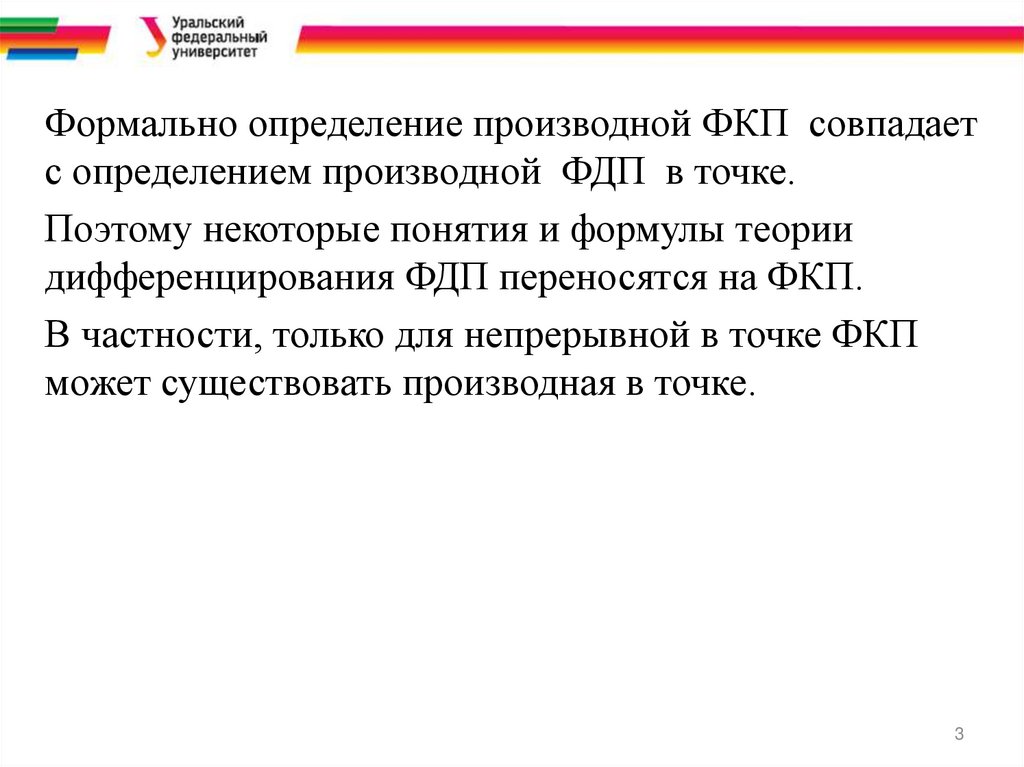 Формально определение производной ФКП совпадаетс определением производной ФДП в точке.