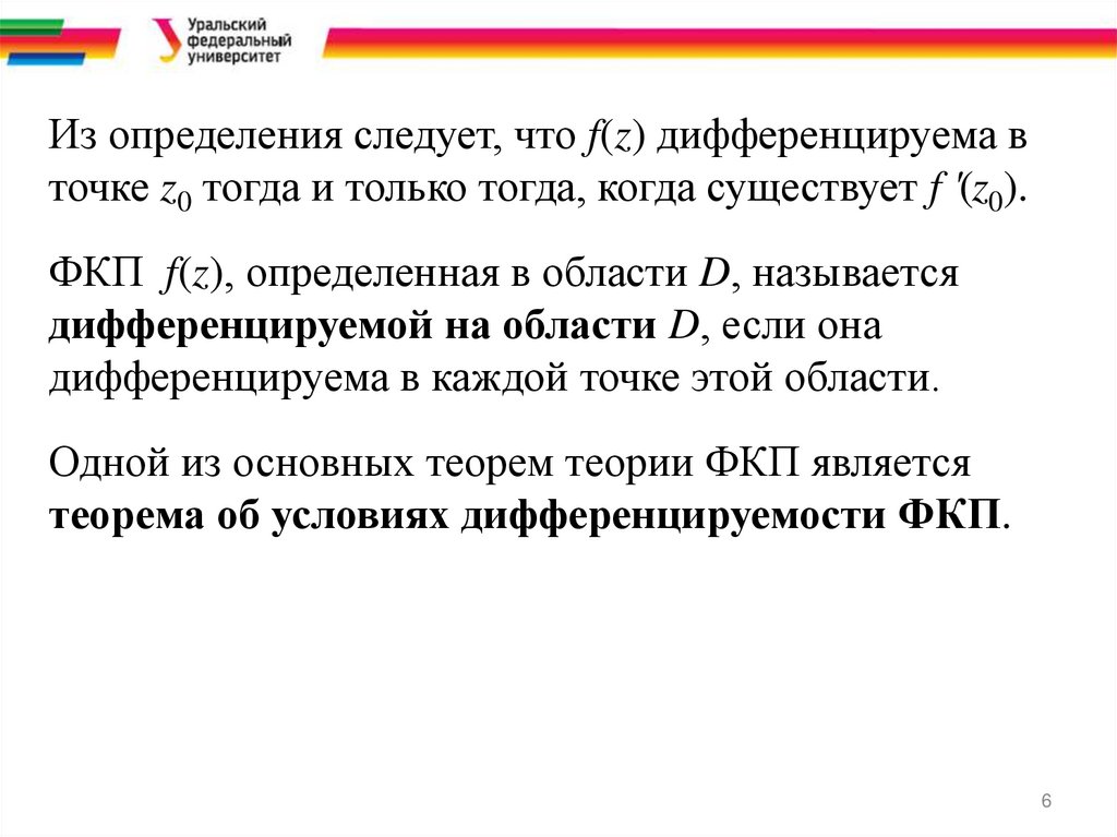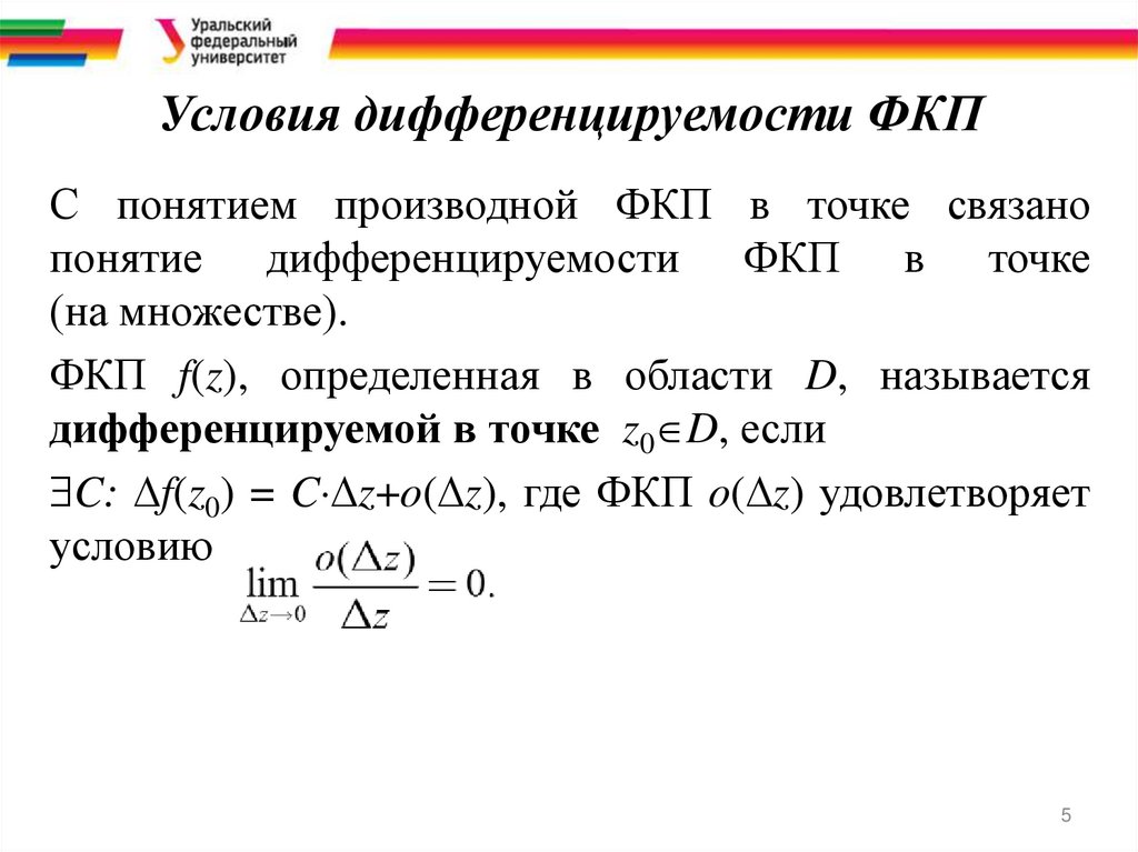 Условия дифференцируемости ФКПС понятием производной ФКП в точке связано