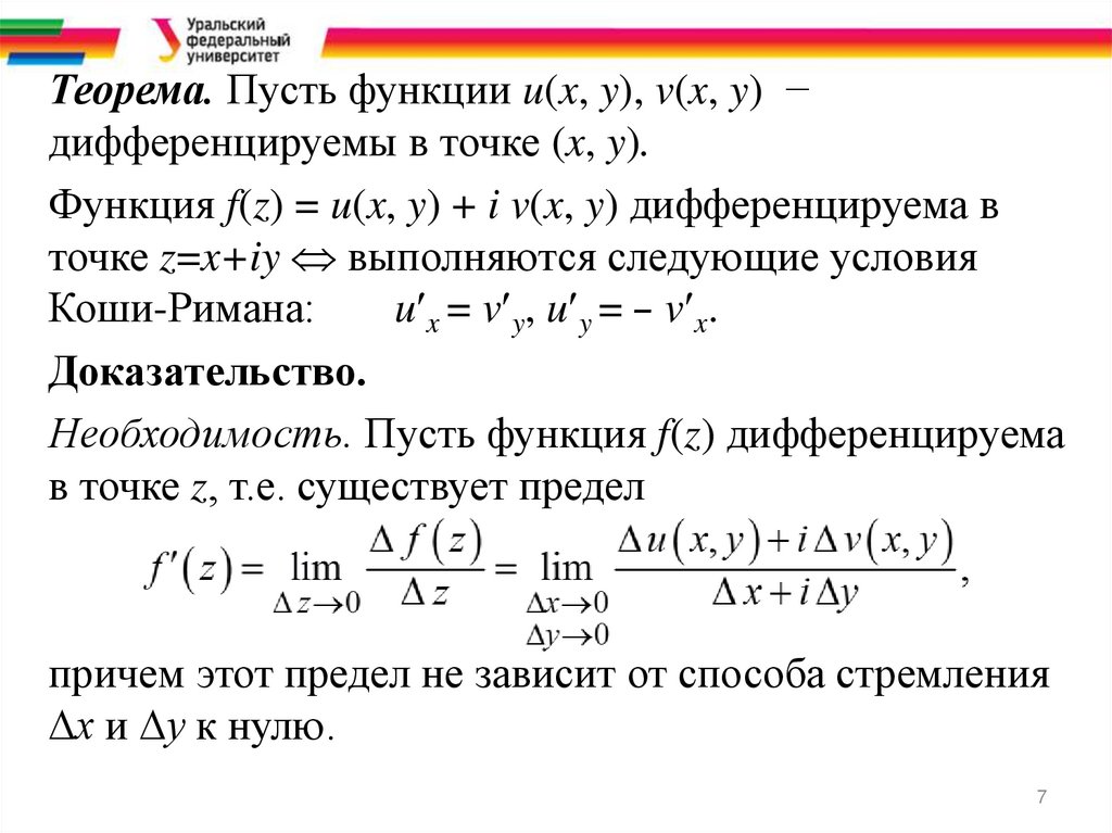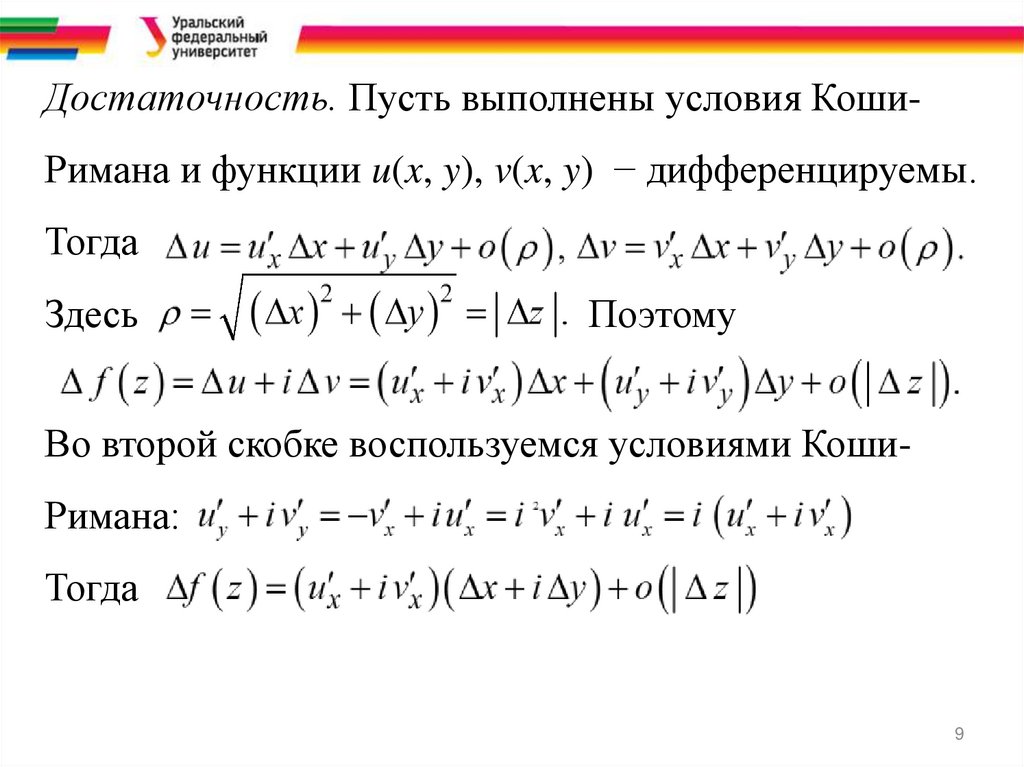 Достаточность. Пусть выполнены условия КошиРимана и функции u(x, y), v(x, y) − дифференцируемы.Тогда