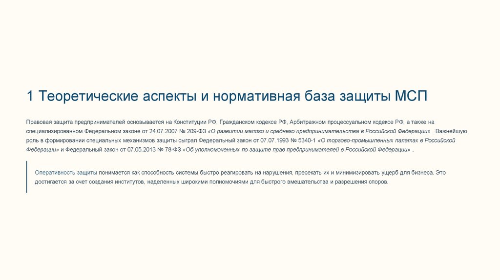 1 Теоретические аспекты и нормативная база защиты МСППравовая защита предпринимателей основывается на Конституции РФ, Гражданском кодексе РФ, Арбитражном процессуальном кодексе РФ, а также на