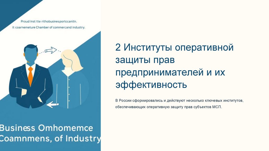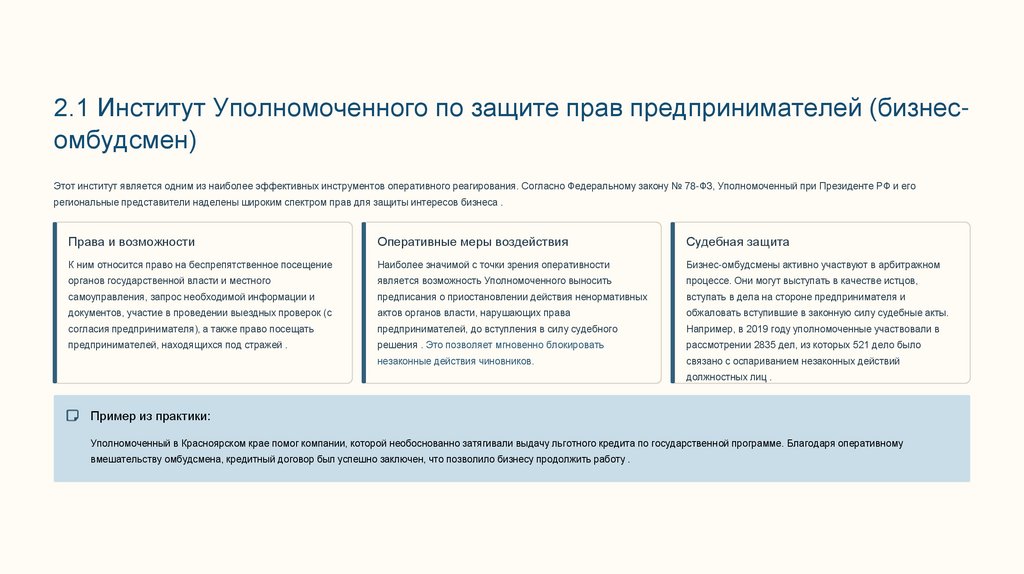 2.1 Институт Уполномоченного по защите прав предпринимателей (бизнесомбудсмен)Этот институт является одним из наиболее эффективных инструментов оперативного реагирования. Согласно Федеральному закону № 78-ФЗ, Уполномоченный при Президенте РФ и его