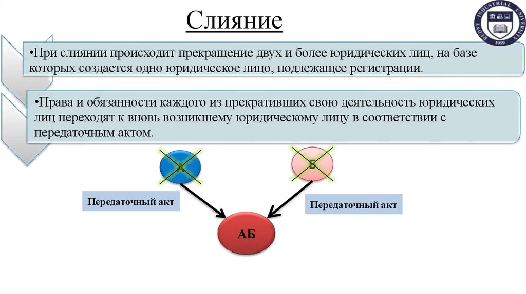 •При слиянии происходит прекращение двух и более юридических лиц, на базекоторых создается одно юридическое лицо, подлежащее регистрации.
