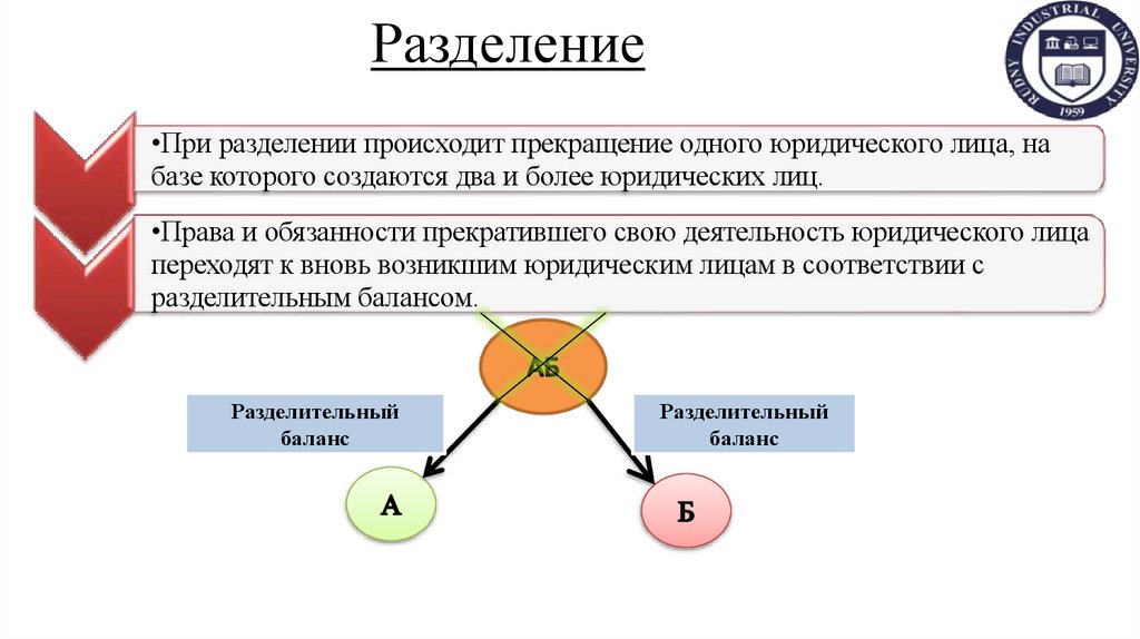 •При разделении происходит прекращение одного юридического лица, набазе которого создаются два и более юридических лиц.
