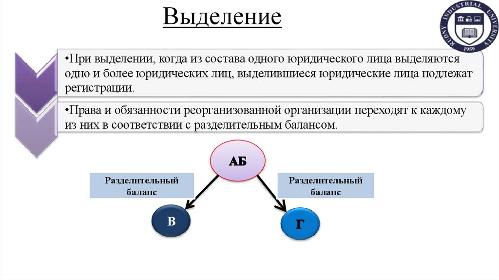 •При выделении, когда из состава одного юридического лица выделяютсяодно и более юридических лиц, выделившиеся юридические лица подлежат