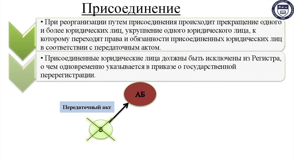 • При реорганизации путем присоединения происходит прекращение одногои более юридических лиц, укрупнение одного юридического лица, к