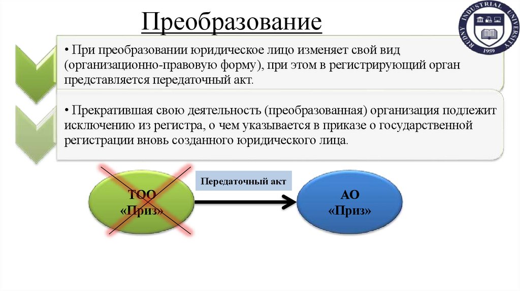 • При преобразовании юридическое лицо изменяет свой вид(организационно-правовую форму), при этом в регистрирующий орган