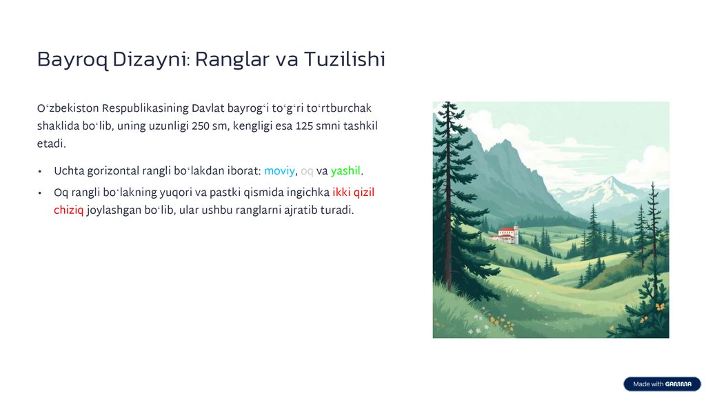Bayroq Dizayni: Ranglar va TuzilishiOʻzbekiston Respublikasining Davlat bayrogʻi toʻgʻri toʻrtburchak