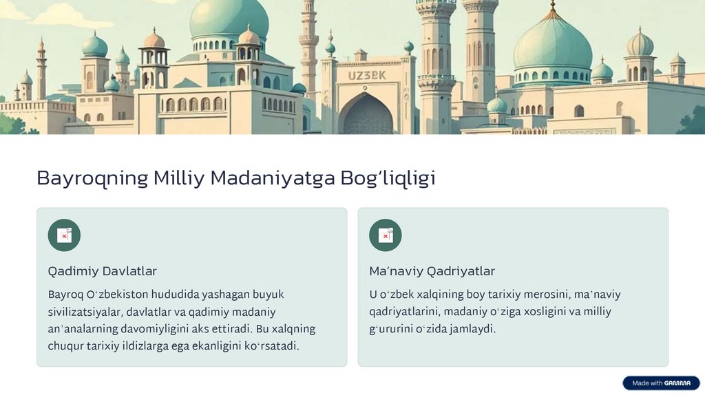 U oʻzbek xalqining boy tarixiy merosini, maʼnaviy