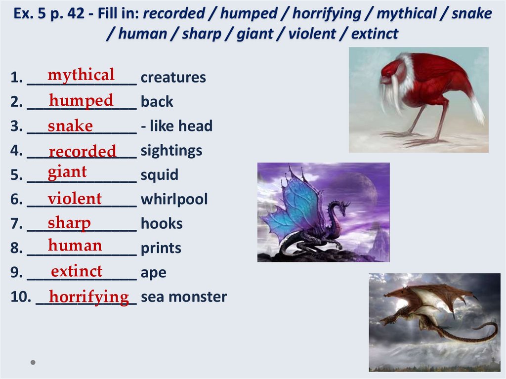 8. Ex. 5 p. 42 - Fill in: recorded / humped / horrifying / mythical / snake / human / sharp / giant / violent / extinct