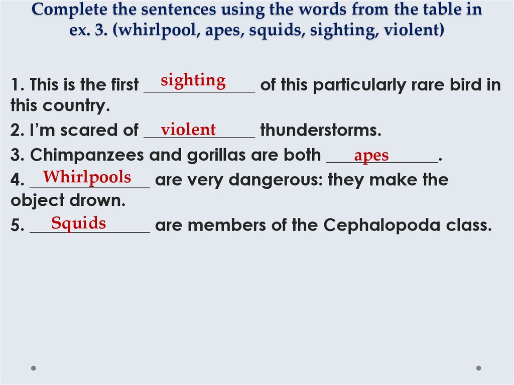 10. Complete the sentences using the words from the table in ex. 3. (whirlpool, apes, squids, sighting, violent)