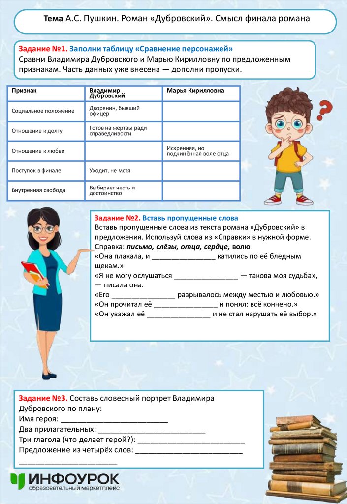 Тема А.С. Пушкин. Роман «Дубровский». Смысл финала романаЗадание №1. Заполни таблицу «Сравнение персонажей»