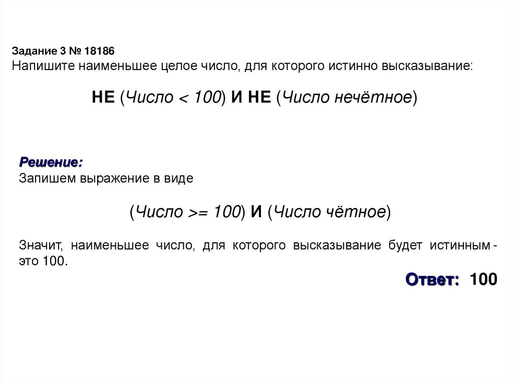 Задание 3 № 18186Напишите наименьшее целое число, для которого истинно высказывание: