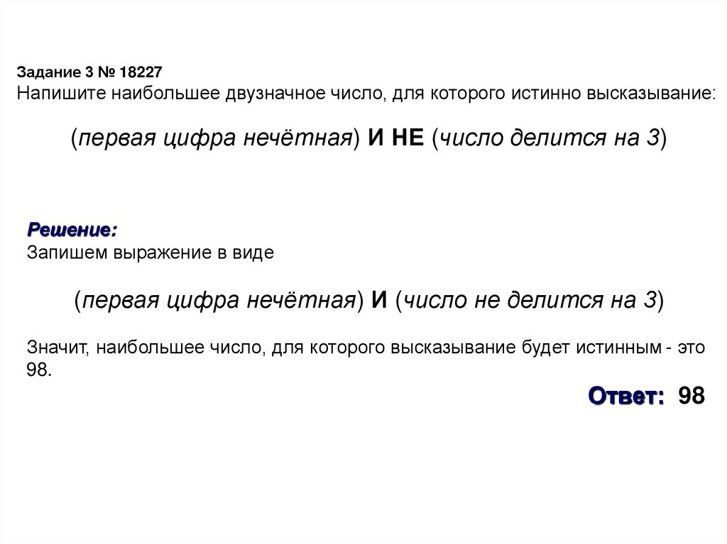 Задание 3 № 18227Напишите наибольшее двузначное число, для которого истинно высказывание: