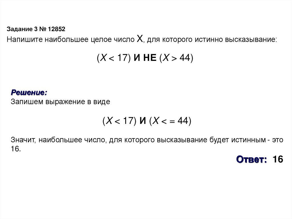 Задание 3 № 12852Напишите наибольшее целое число X, для которого истинно высказывание: