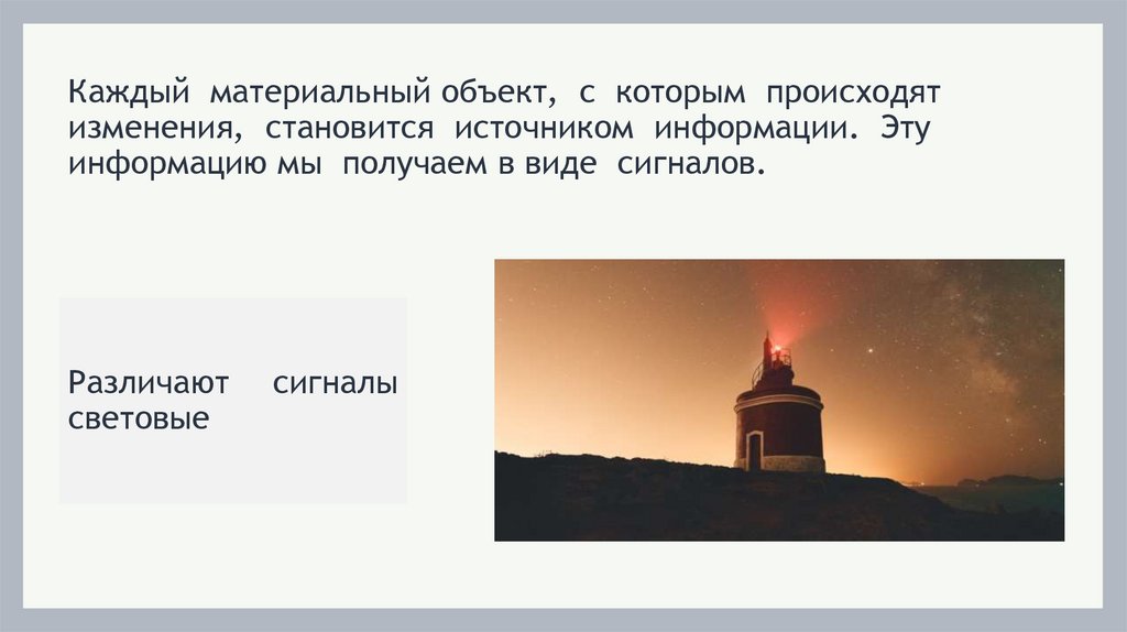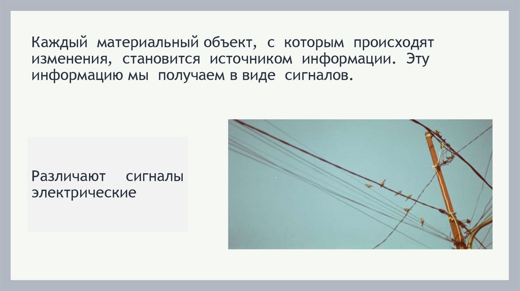 Каждый материальный объект, с которым происходятизменения, становится источником информации. Эту
