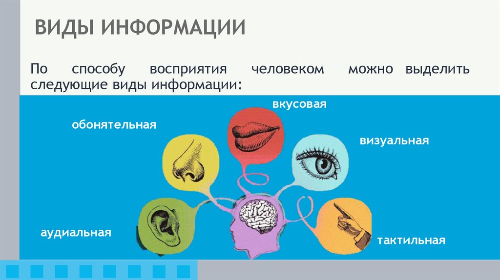 аудиальную, обонятельную, вкусовую, тактильную информацию.