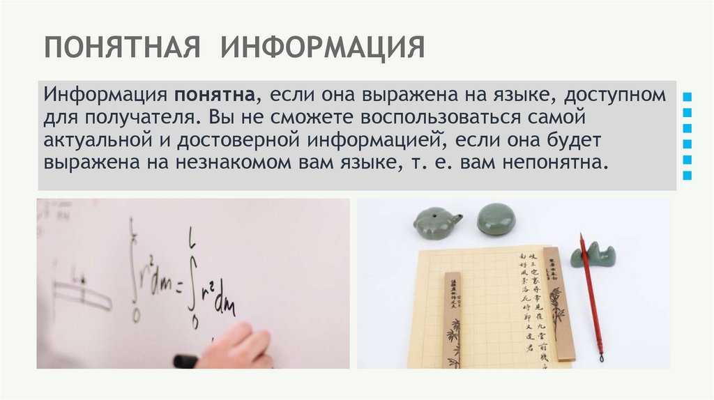 Информация понятна, если она выражена на языке, доступномдля получателя. Вы не сможете воспользоваться самой