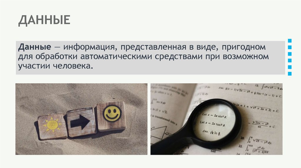 Данные — информация, представленная в виде, пригодномдля обработки автоматическими средствами при возможном