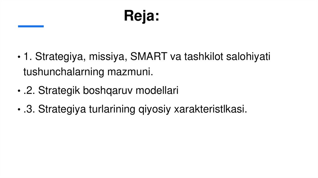 • 1. Strategiya, missiya, SMART va tashkilot salohiyatitushunchalarning mazmuni.