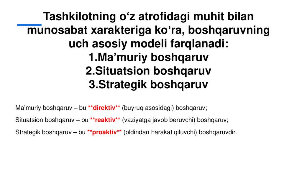 11. Tashkilotning o‘z atrofidagi muhit bilan munosabat xarakteriga ko‘ra, boshqaruvning uch asosiy modeli farqlanadi: 1.Ma’muriy