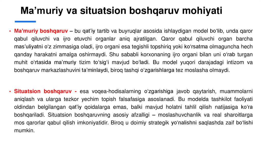 • Situatsion boshqaruv - esa voqea-hodisalarning o‘zgarishiga javob qaytarish, muammolarni