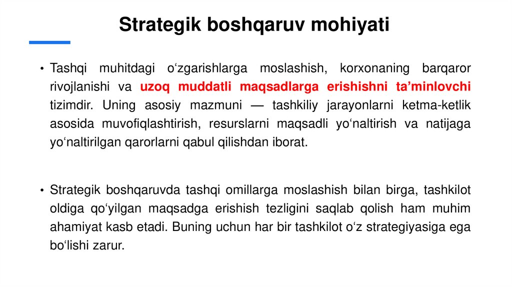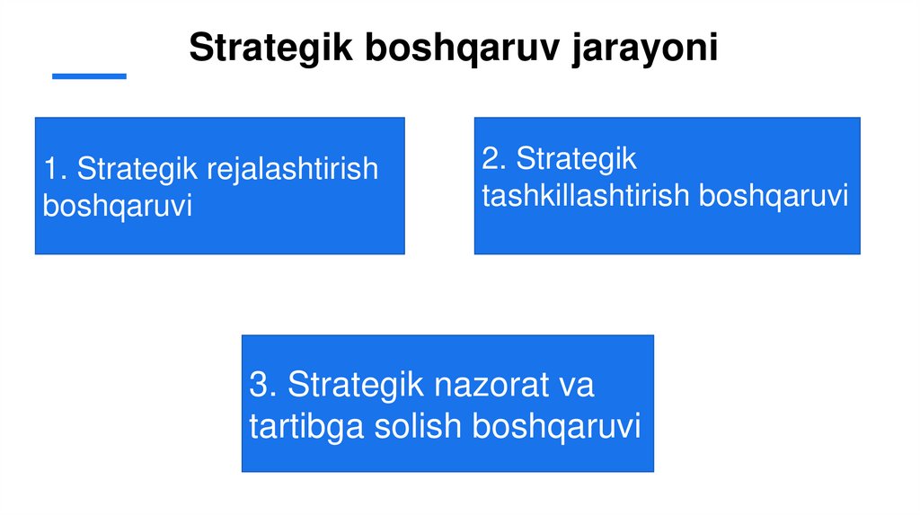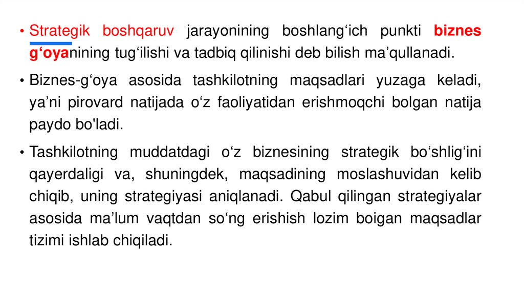 • Strategik boshqaruv jarayonining boshlang‘ich punkti biznesg‘oyanining tug‘ilishi va tadbiq qilinishi deb bilish ma’qullanadi.