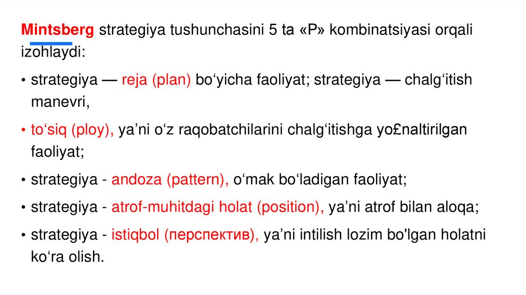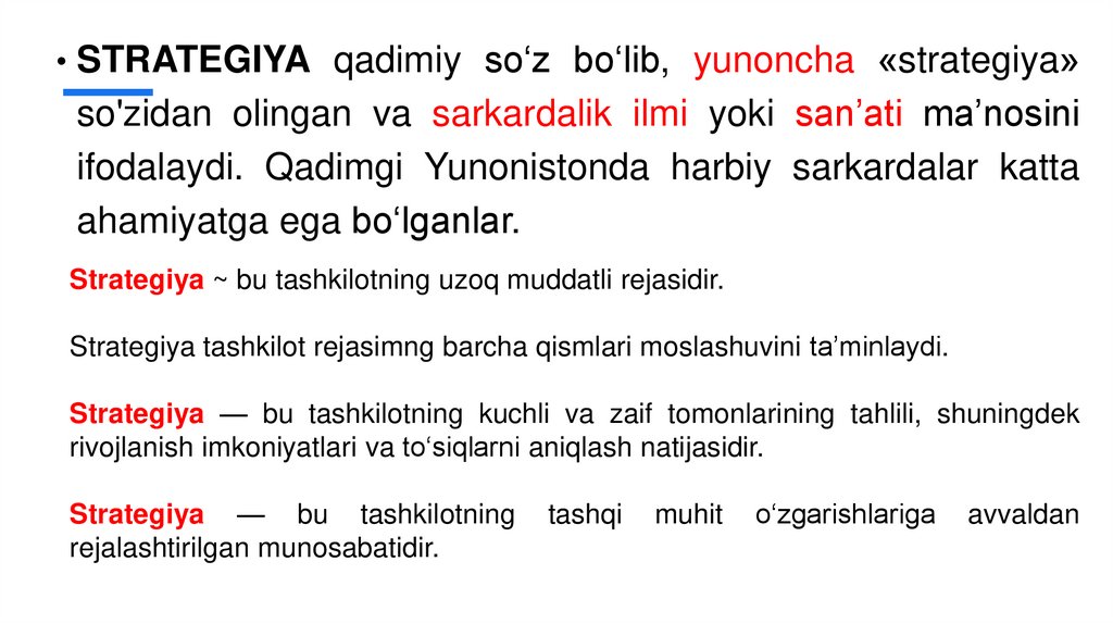 • Bu strategiyalar korxonaning umumiy rivojlanish yo‘nalishini