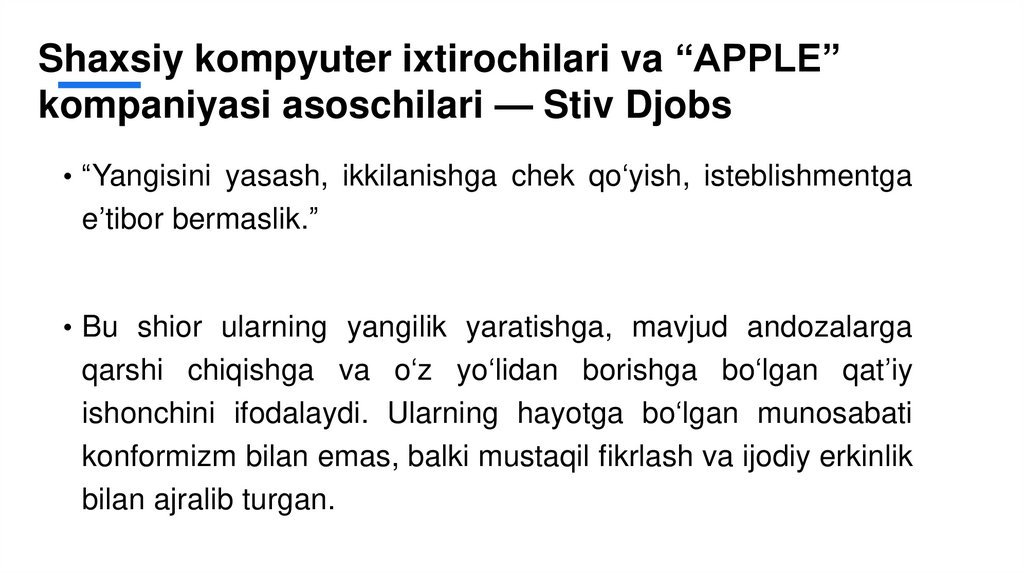 18. Shaxsiy kompyuter ixtirochilari va “APPLE” kompaniyasi asoschilari — Stiv Djobs
