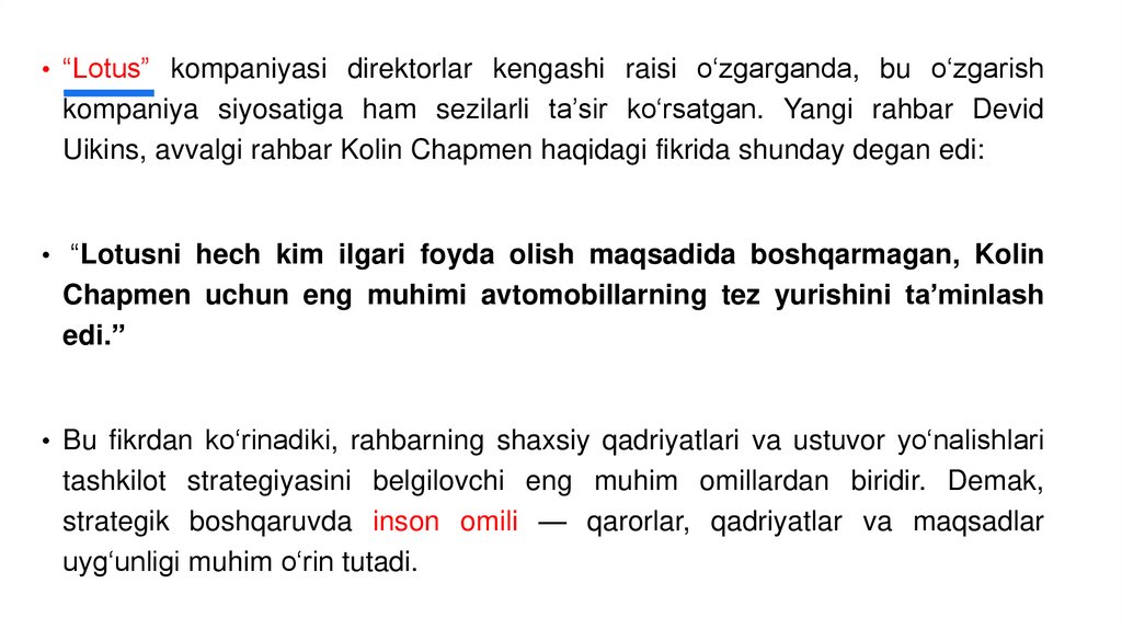 • “Lotus” kompaniyasi direktorlar kengashi raisi o‘zgarganda, bu o‘zgarishkompaniya siyosatiga ham sezilarli ta’sir ko‘rsatgan. Yangi rahbar Devid