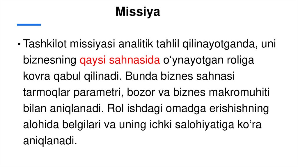 • Tashkilot missiyasi analitik tahlil qilinayotganda, unibiznesning qaysi sahnasida o‘ynayotgan roliga