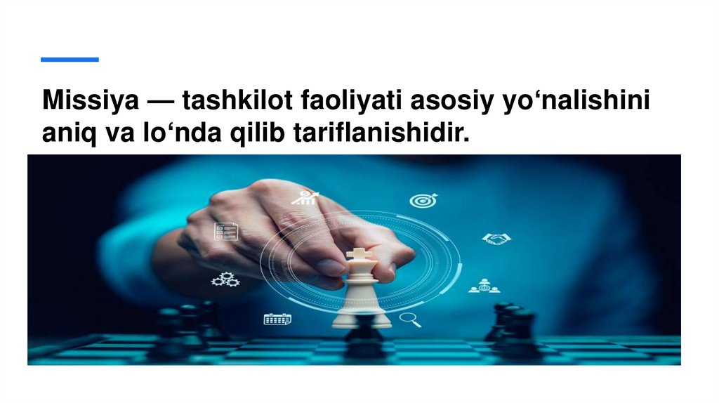 21. Missiya — tashkilot faoliyati asosiy yo‘nalishini aniq va lo‘nda qilib tariflanishidir.