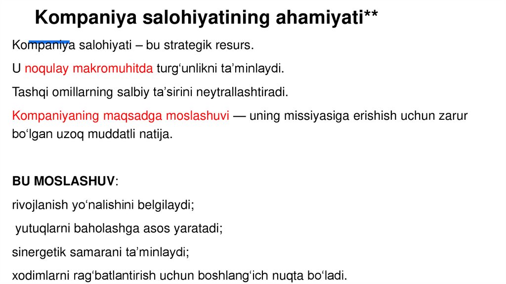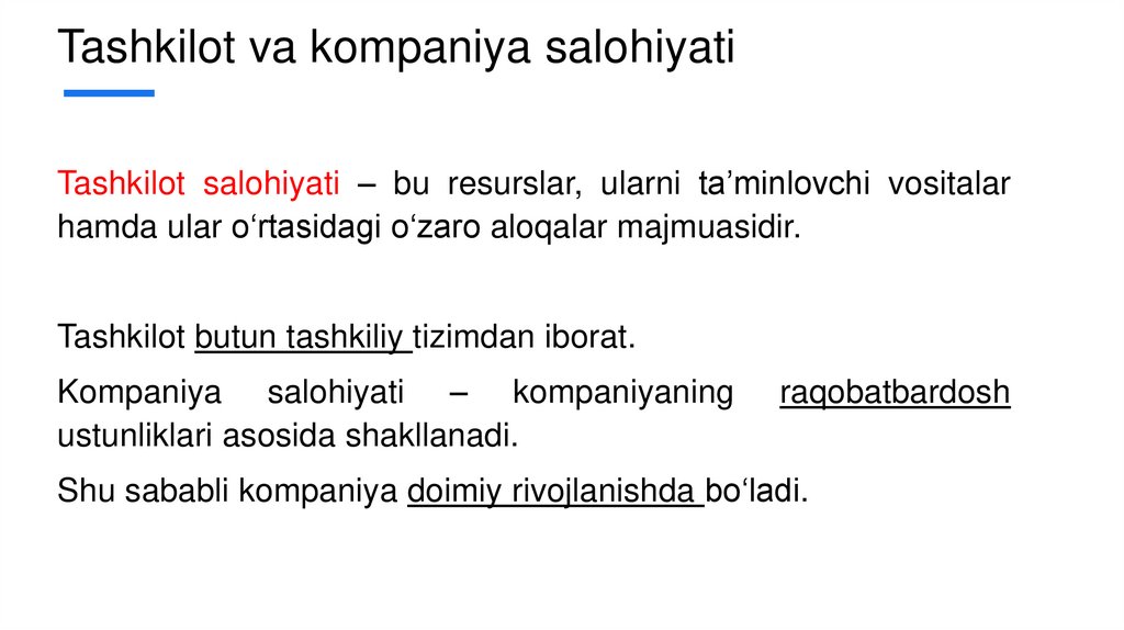 Kompaniya salohiyati – bu strategik resurs.U noqulay makromuhitda turg‘unlikni ta’minlaydi.