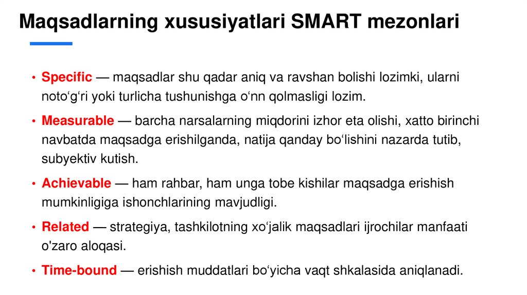 • Specific — maqsadlar shu qadar aniq va ravshan bolishi lozimki, ularninoto‘g‘ri yoki turlicha tushunishga o‘nn qolmasligi lozim.