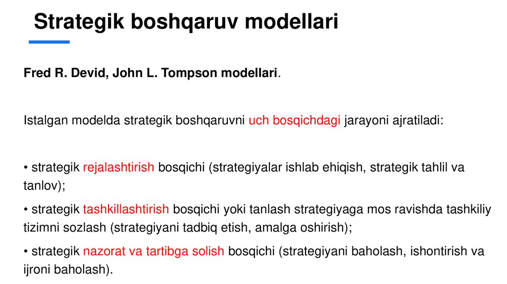 Fred R. Devid, John L. Tompson modellari.Istalgan modelda strategik boshqaruvni uch bosqichdagi jarayoni ajratiladi:
