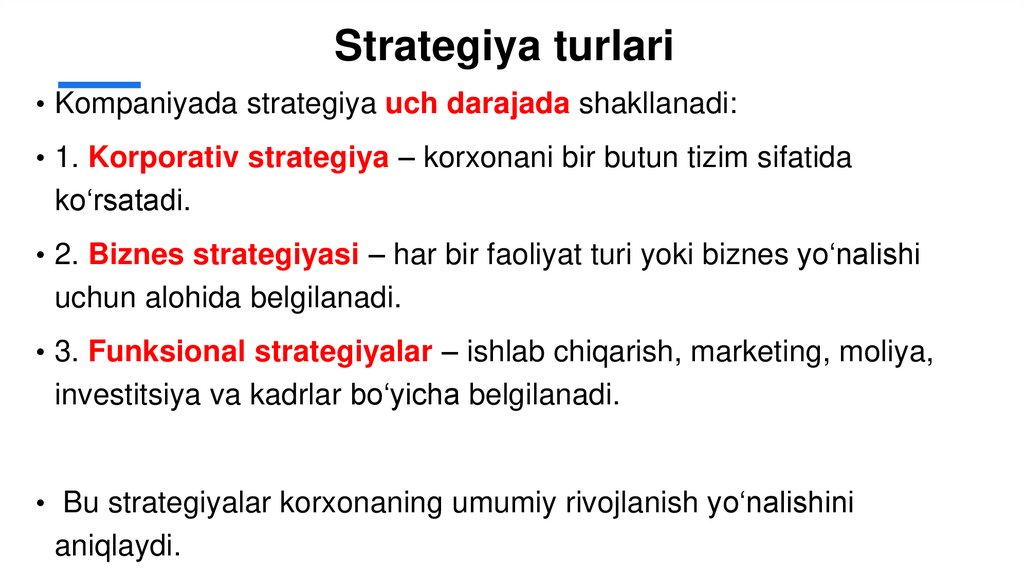 • Kompaniyada strategiya uch darajada shakllanadi:• 1. Korporativ strategiya – korxonani bir butun tizim sifatida
