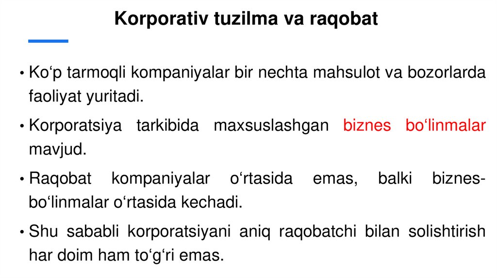• Ko‘p tarmoqli kompaniyalar bir nechta mahsulot va bozorlardafaoliyat yuritadi.