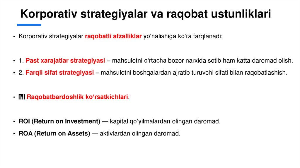 • Korporativ strategiyalar raqobatli afzalliklar yo‘nalishiga ko‘ra farqlanadi:• 1. Past xarajatlar strategiyasi – mahsulotni o‘rtacha bozor narxida sotib ham katta daromad olish.