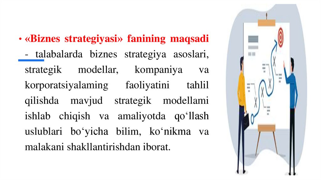 • «Biznes strategiyasi» fanining maqsadi- talabalarda biznes strategiya asoslari,