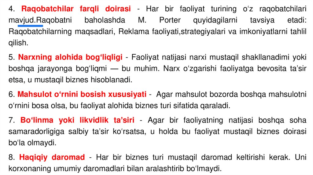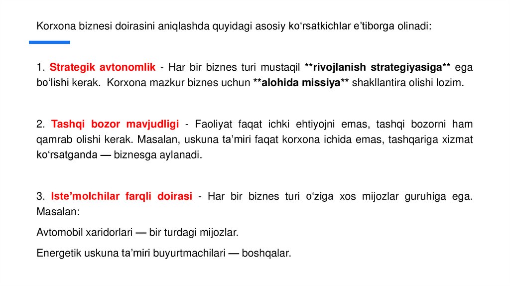 • 2. Biznes strategiyasi – har bir faoliyat turi yoki biznes yo‘nalishi