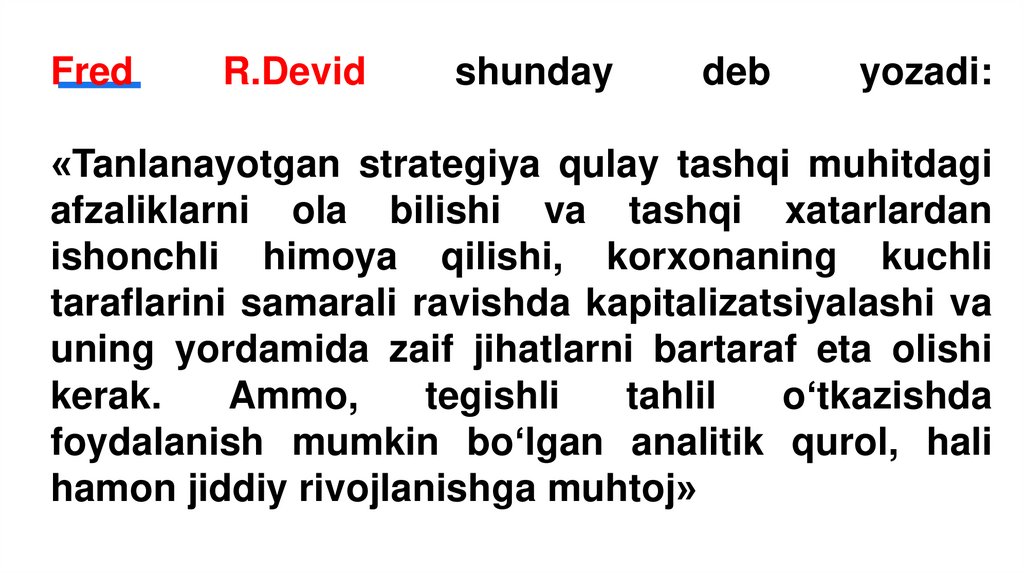 7. Fred R.Devid shunday deb yozadi: «Tanlanayotgan strategiya qulay tashqi muhitdagi afzaliklarni ola bilishi va tashqi
