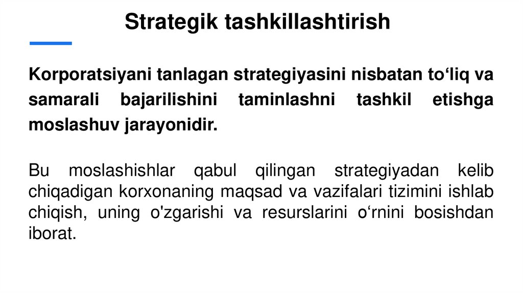 Korporatsiyani tanlagan strategiyasini nisbatan to‘liq vasamarali bajarilishini taminlashni tashkil etishga