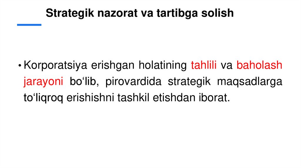 • Korporatsiya erishgan holatining tahlili va baholashjarayoni bo‘lib, pirovardida strategik maqsadlarga
