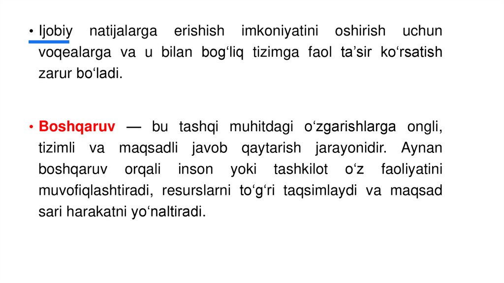 • Boshqaruv — bu tashqi muhitdagi o‘zgarishlarga ongli,