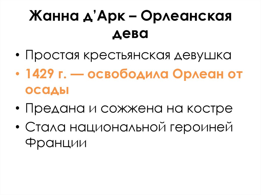 • Простая крестьянская девушка• 1429 г. — освободила Орлеан от