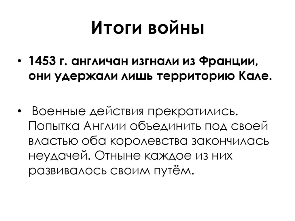 • 1453 г. англичан изгнали из Франции,они удержали лишь территорию Кале.