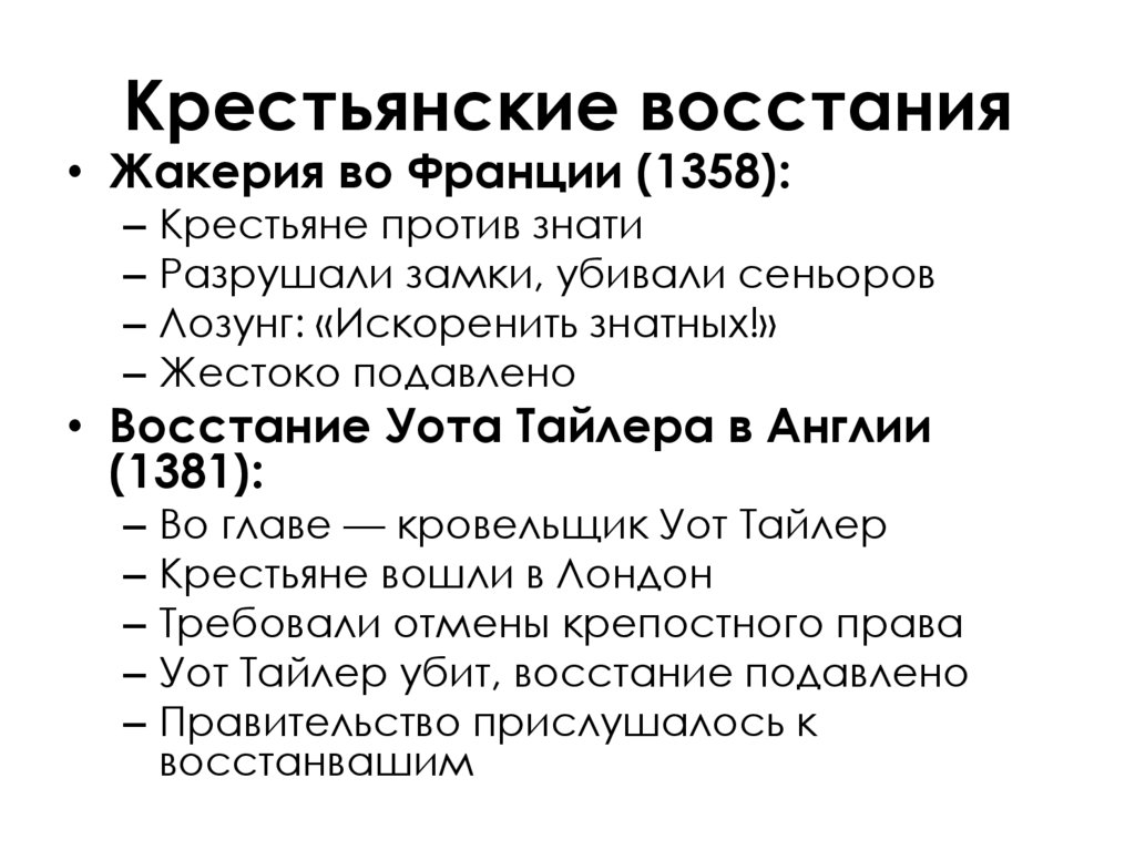 • Жакерия во Франции (1358):– Крестьяне против знати